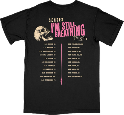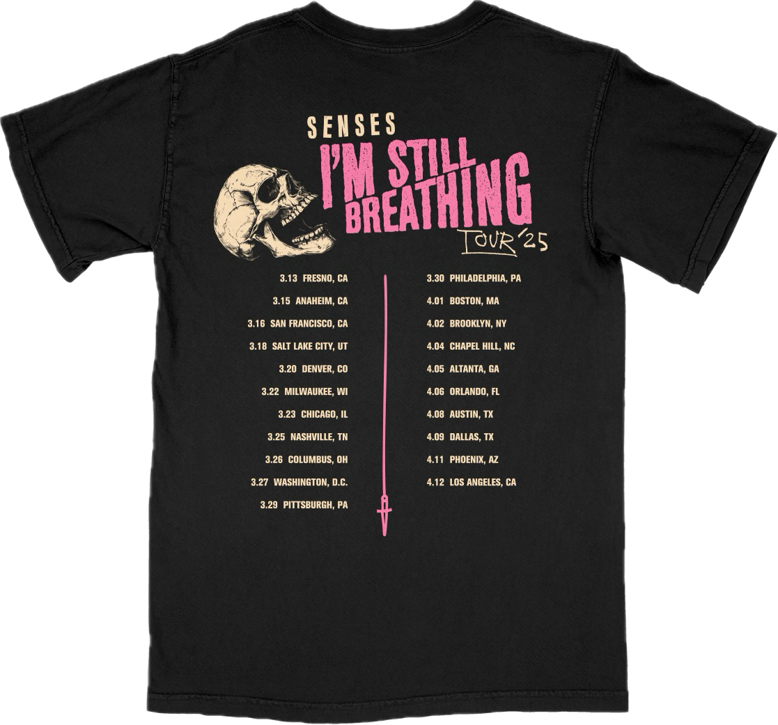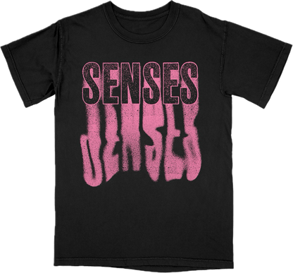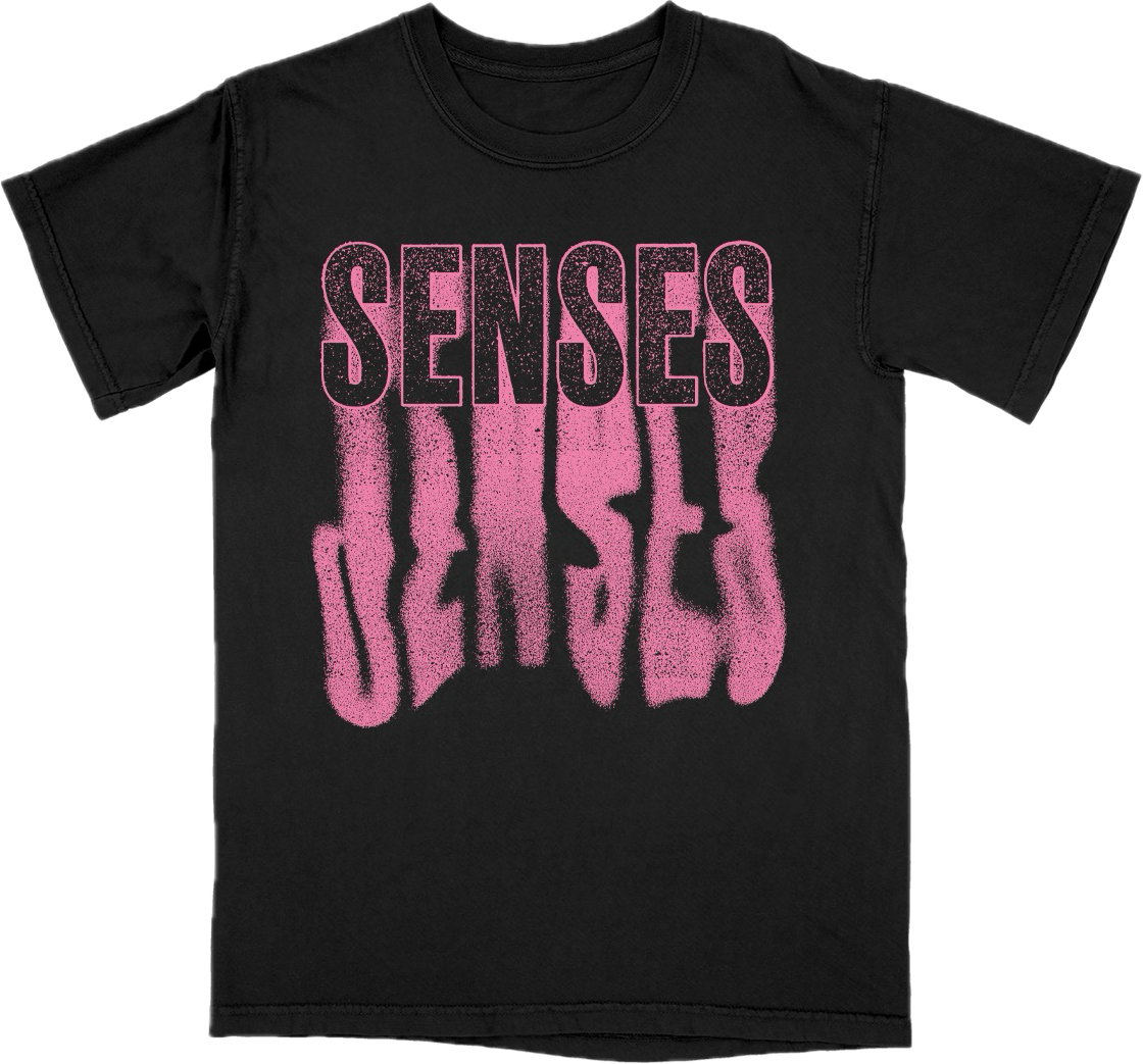 black unisex t-shirt with senses drip logo in muted pink on the front, and the tour title as well as all cities and dates on the back in both muted pink and yellow.